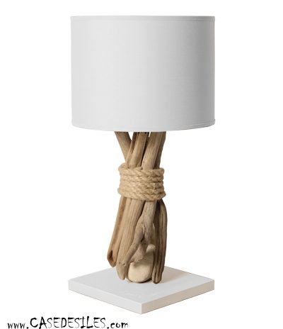 Le socle de la lampe est en bois flotté couleur blanche.