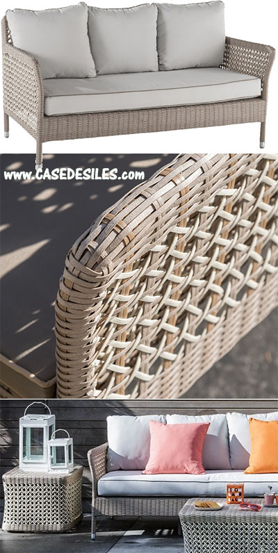 Canapé de jardin aux lignes simples et compactes avec un formidable tressage dans l’esprit des tissages de cannage à l’ancienne dans un ton naturel.