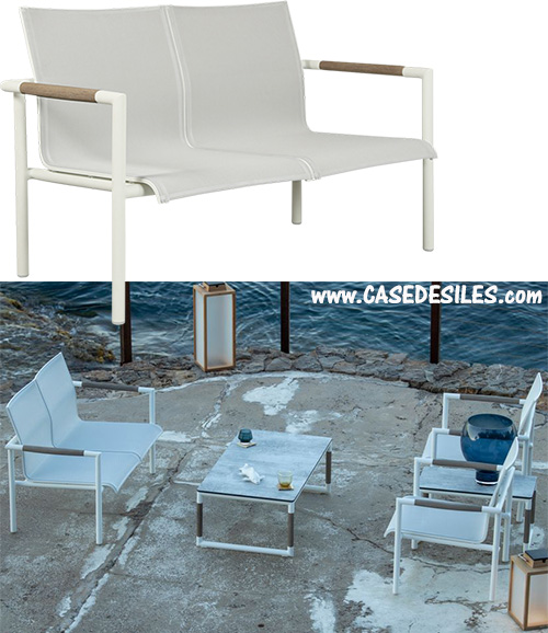 Ce canapé pour 2 personnes se caractérise par la légèreté et son côté fonctionnel car empilable avec son savant mélange de matières : de l’aluminium, du teck et de la toile perforée.
