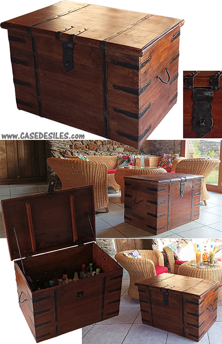 Le bois dispose d’une finition vernie et teintée, même à l’intérieur du coffre et les ferrures sont peintes de couleur noire avec patine à l’ancienne. Ce qui les procure un style unique mais compatible dans tout style de décoration d’intérieur du plus classique au plus moderne.