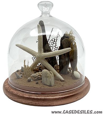 Ce cabinet de curiosités marines est composé de coquillages, des bois, des galets, des gorgones et de sable sous une cloche en verre.