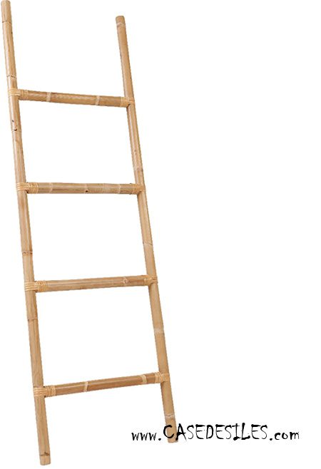 Cette échelle en canne de rotin naturel peut être utilisée en porte-serviette dans un salle de bain avec une touche naturelle et exotique.