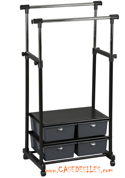 Portant réglable à double barres avec 4 tiroirs en PVC et acier sur roulettes noir : CDI309