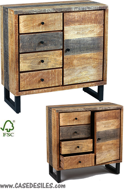 Meuble d’entrée en bois et métal acier à 4 tiroirs et 1 porte finition aspect trait de scie : 3457