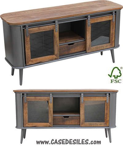 Meuble TV industriel en bois et métal à portes coulissantes : 3493